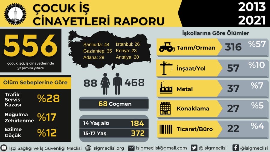 2013 yılında en az 59 çocuk işçi, 2014 yılında en az 54 çocuk işçi, 2015 yılında en az 63 çocuk işçi, 2016 yılında en az 56 çocuk işçi, 2017 yılında en az 60 çocuk işçi, 2018 yılında en az 67 çocuk işçi, 2019 yılında en az 67 çocuk işçi, 2020 yılında en az 68 çocuk işçi, 2021 yılında en az 62 çocuk işçi olmak üzere son dokuz yılda en az 556 çocuk çalışırken hayatını kaybetti...