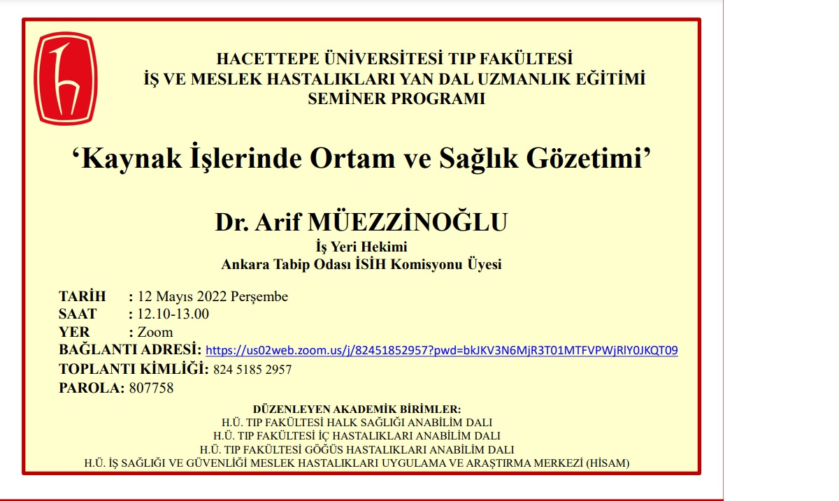 Hacettepe Üniversitesi Tıp Fakültesi Halk Sağlığı, Göğüs Hastalıkları ve İç Hastalıkları Anabilim Dalları tarafından Hacettepe Üniversitesi İş Sağlığı ve Güvenliği Meslek Hastalıkları Uygulama ve Araştırma Merkezi (HİSAM) iş birliği ile düzenlenen, İş ve Meslek Hastalıkları Seminer Programı kapsamında Dr. Arif MÜEZZİNOĞLU (İş Yeri Hekimi, Ankara Tabip Odası İSİH Komisyonu Üyesi ) 12 Mayıs 2022 Perşembe günü Saat: 12.10-13.00 arasında “Zoom” uygulaması üzerinden “Kaynak İşlerinde Ortam ve Sağlık Gözetimi” başlıklı semineri sunacaktır. Seminer afişi ektedir.