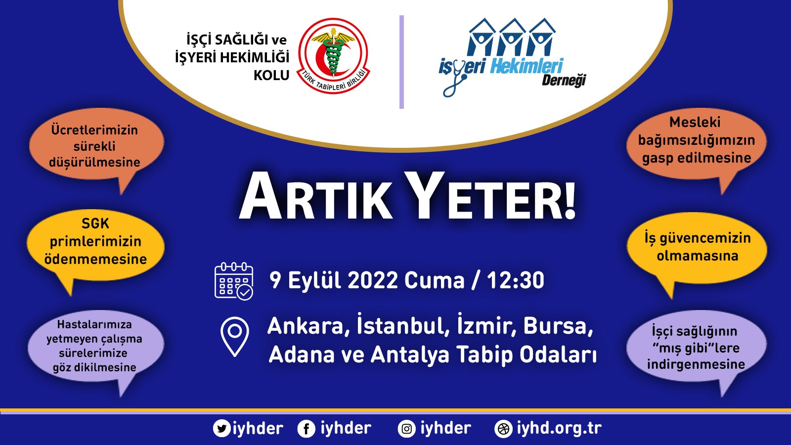 Biz işyeri hekimlerinin ücretleri tarihimizin en düşük seviyesine geriledi. Çalışma şartlarımız olağanüstü ağırlaştı ve iş güvencemiz ortadan kalktı. Maaşlarımız düzenli ödenmiyor. SGK primlerimiz OSGB (Ortak Sağlık Güvenlik Birimleri) şirketleri tarafından eksik yatırılarak geleceğimiz gasp ediliyor. Kullandığımız araç ve akaryakıt harcamaları ile bilgisayar ve internet gibi giderleri kendimiz ödemek zorunda kalıyoruz. İzin hakkımızın kısıtlandığı, Çalışma ve Sosyal Güvenlik Bakanlığı tarafından yerinde ve etkili denetimlerin yapılmadığı, ama en önemlisi de mesleki bağımsızlığımızın her geçen gün erozyona uğratıldığı bir ortamda çalışmaktan yıldık, yorulduk.